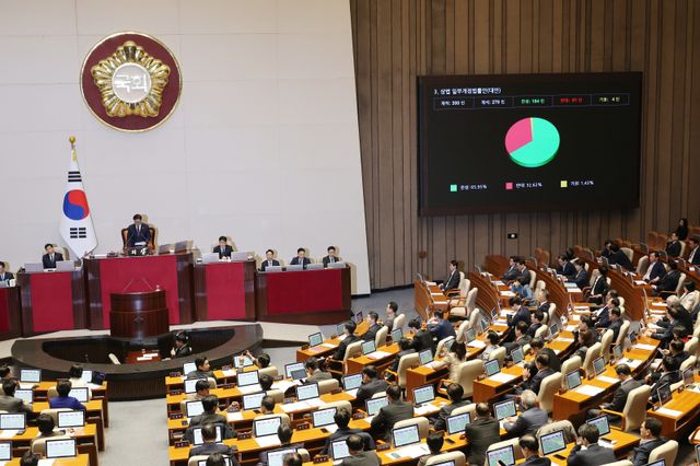 더불어민주당 등 야당 주도로 13일 국회 본회의에서 표결에 부쳐진 상법 개정안은 재석 279명 중 찬성 184명, 반대 91명, 기권 4명으로 가결됐다. 민주당이 당론 발의한 상법 개정안은 이사가 충실해야 하는 대상을 기존의 '회사'에서 '회사 및 주주'로 넓히고, 상장 회사의 전자 주주총회 도입을 의무화하는 내용 등이 골자다.
