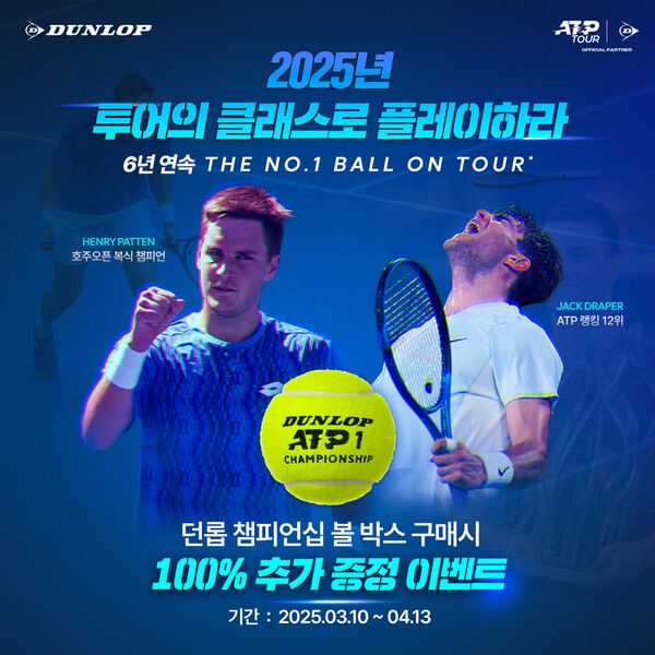 [STN뉴스] 이상완 기자 = 던롭스포츠코리아(대표 홍순성)가 전개하는 글로벌 테니스 브랜드 던롭(DUNLOP)은 ATP투어와 2019년부터 이어온 파트너십으로 6개년 연속 볼 사용률 1위를 기념하여 ATP 챔피언십 1박스 구매 시 6캔을 증정하는 프로모션을 진행한다.