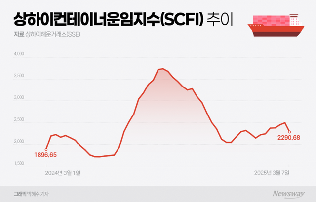 2024년 3월 1일부터 2025년 3월 7일까지 상하이컨테이너운임지수(SCFI) 추이다. 자료=상하이해운거래소(SSE)