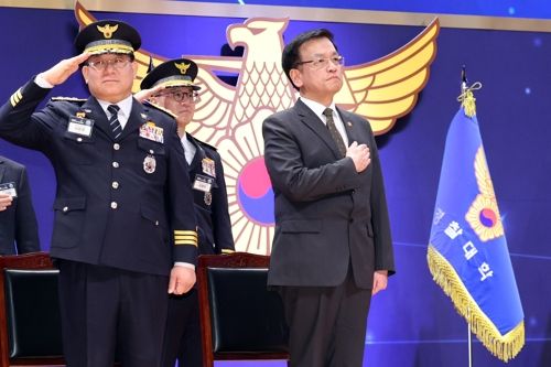최상목 대통령 권한대행 부총리 겸 기획재정부 장관이 13일 충남 아산시 경찰대학에서 열린 2025년 신임경찰 경위·경감 임용식에서 국기에 경례하고 있다. 2025.3.13 [대통령실통신사진기자단]