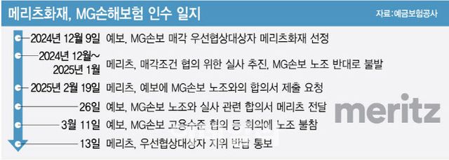 MG손보는 2012년 부실 금융기관으로 지정된 후 2013년 새마을금고중앙회가 인수했다. 하지만 정상화에 실패했고 금융위원회는 2023년 예보를 통해 다시 매각을 추진했다. 네 차례 매각이 무산된 후 지난해 12월 메리츠화재가 인수 의사를 밝혔으나 결국 협상이 결렬됐다.
