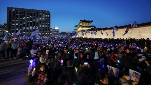 13일 서울 종로구 광화문 동십자각 앞에서 열린 야5당 공동 비상시국 범국민대회에서 참가자들이 구호를 외치고 있다. 2025.3.13