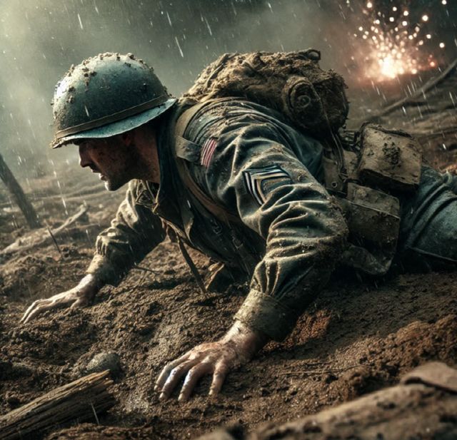 이후 그는 오로지 생존을 위한 싸움을 시작했다. 적과 아군의 총알과 땅에 묻힌 지뢰를 피할 방법은 천천히 기어가는 것뿐이었다. 고막이 터지고 두개골과 몸통에 파편이 박힌 상태였지만, 그는 살아남기 위해 지뢰밭을 기어가기 시작했다.