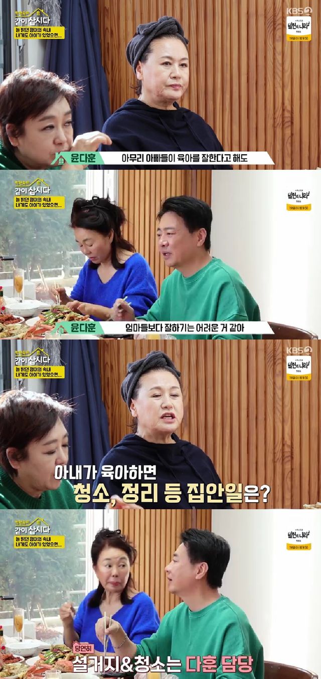 박원숙은 "엄마가 전적으로 (육아를) 할 수 있게 청소를 한다거나 설거지를 한다거나"라며 제안했고, 윤다훈은 "설거지, 청소 제가 한다"고 설명했다.