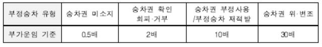 부정승차 유형에 따른 부가운임 기준 / 코레일
