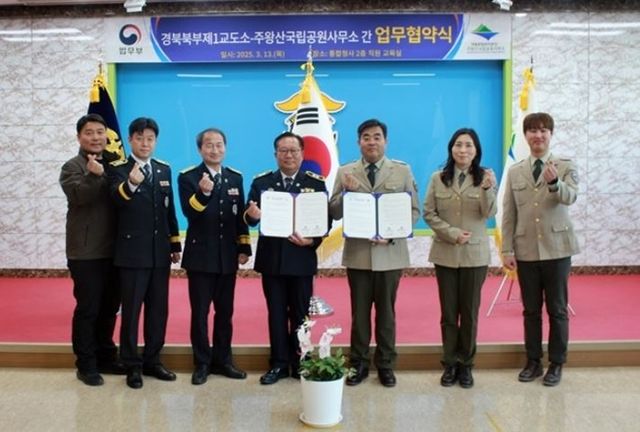 경북북부제1교도소(소장 최진규)는 13일 통합청사 2층 직원교육실에서 주왕산국립공원사무소와 수형자 교정교화 및 상호 발전을 위한 업무협약을 체결했다. / 사진제공=경북북부제1교도소