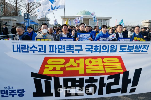 민주당 의원들은 여의도에서 광화문까지 도보 행진을 이틀째 이어가고 있다. 윤종군 민주당 원내대변인은 “국민과 함께 탄핵의 조속한 인용 여론전 확산에 총력을 기울이자는 차원에서 어떤 행동이 필요하냐에 관한 논의가 많았다”며 “민주수호, 헌정수호의 날 같은 개념으로 12일 국회에서 관련 입장을 발표하고, 광화문까지 전체 의원이 거리 행진하자는 제안이 있었다”고 말했다.
