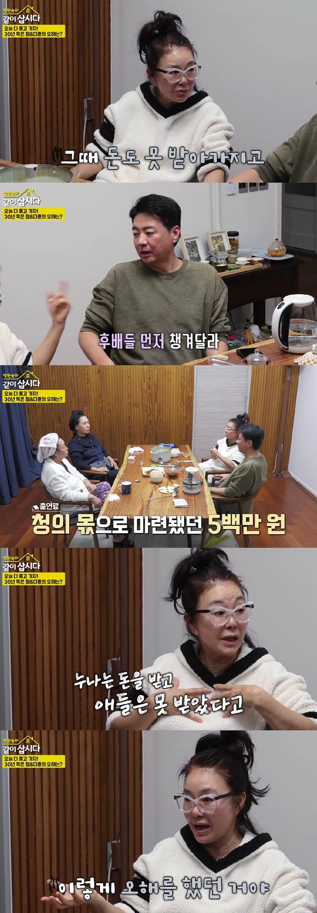 이어 김청은 "나한테 (출연료) 5백만 원을 만들어왔다. 그대로 '그 돈으로 애들 먼저 주라'고 했다. 근데 윤다훈이 나는 돈을 받고 애들은 못 받았다고 오해를 했더라"며 "굉장히 서운하고 섭섭했다"고 마음의 골을 고백했다.