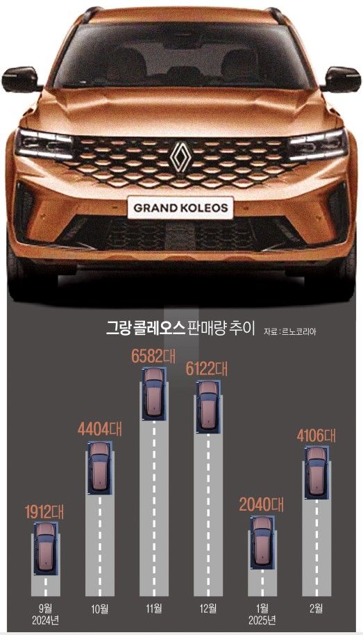 르노코리아에 따르면 그랑 콜레오스는 출시 초반인 지난해 9월 1912대, 10월 4404대를 팔았고 11월(6582대)과 12월(6122대)엔 판매량 증가세가 본궤도에 올랐다.