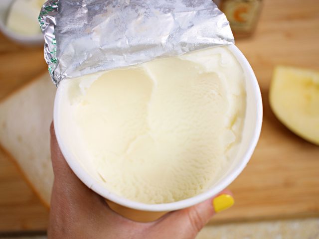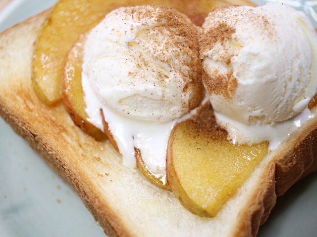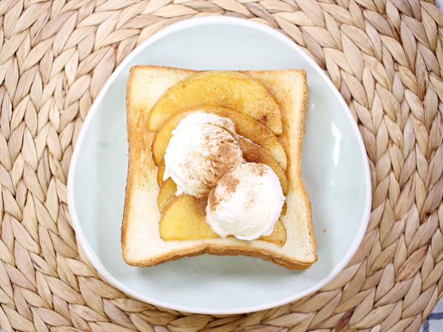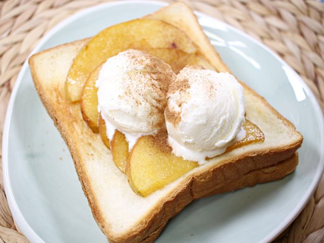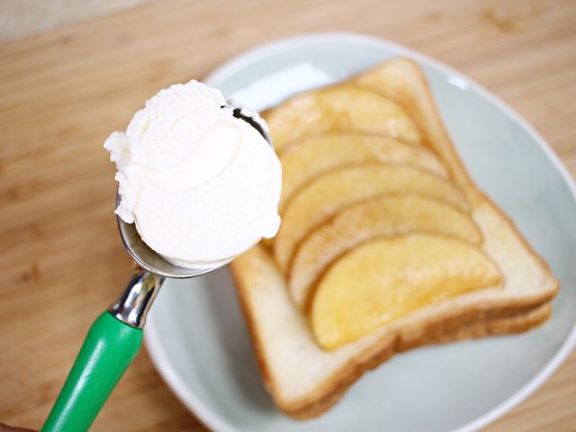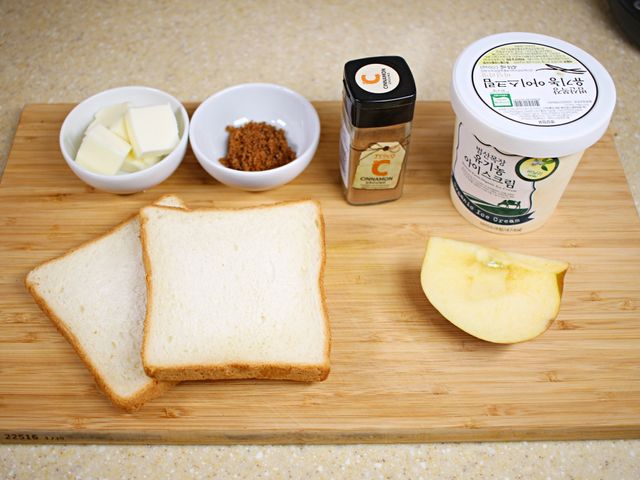 아이스크림, 식빵, 사과, 버터, 갈색설탕, 계피가루를 준비해요.