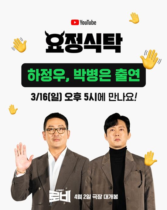 '로비'가 오는 4월 2일 개봉을 앞두고 본격 홍보 릴레이의 첫 시작을 유튜브 '요정재형'과 함께 한다. '로비' 연출과 스타트업 대표 창욱 역 연기를 동시에 도전한 하정우와 로비에 능한 라이벌 회사 대표 광우 역을 맡은 배우 박병은이 출연한다.