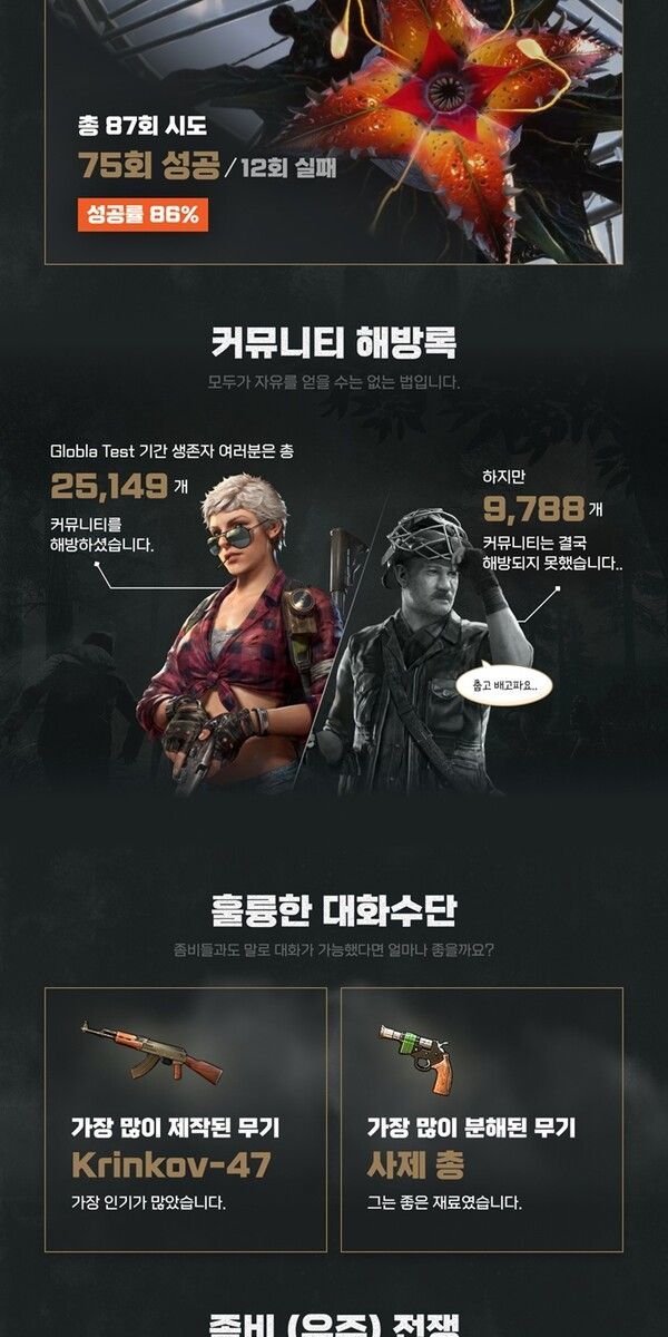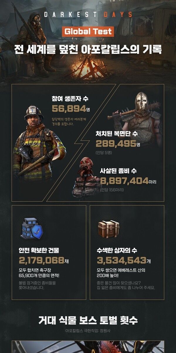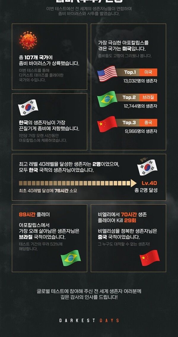 이번 글로벌 테스트는 8일 간 전세계 107개 국가에서 약 57,000여 명의 이용자들이 참여하면서 타깃 이용자들의 게임성에 대한 만족도, 긍정적인 반응을 모두 확인할 수 있었다. 특히 글로벌에서의 성과가 두드러졌다. 미국, 브라질, 중국 순으로 많은 이용자가 플레이 하며, 슈팅 게임의 인기가 높은 지역에서 본격적으로 좀비 사냥에 나섰다. 한국은 1인 당 평균적으로 가장 오랜 시간 게임에 접속하며 글로벌에 버금가는 성과를 냈다.