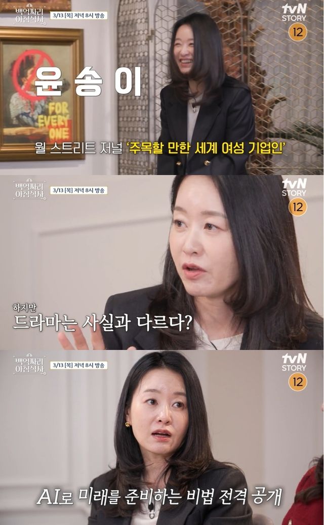 13일 방송된 tvN STORY '백억짜리 아침식사' 4회에서는 미국 내 한국인 중 최연소 박사학위 취득, 28세 대기업 임원 발탁 등 세계 1%의 엘리트 윤송이 대표의 성공 비밀을 파헤쳤다.