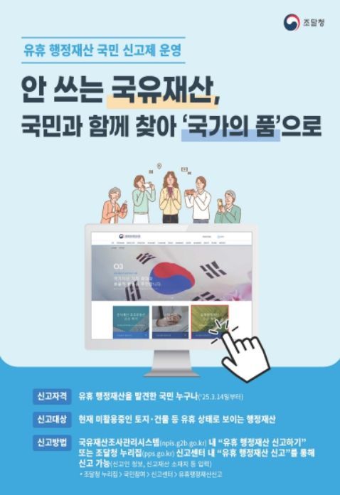 [와이뉴스] 조달청은 정부기관 등이 활용하지 않고 있는 토지나 건물 등 국유재산에 대하여 국민 누구나 직접 신고할 수 있는 ‘유휴 행정재산 국민 신고제’를 14일부터 도입해 운영한다고 밝혔다.