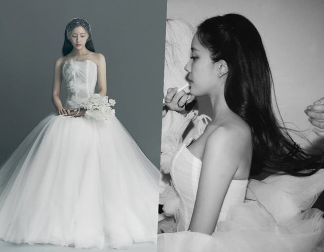웨딩화보 속 다양한 드레스와 무드 속에서 예비신부 효민은 세상에서 가장 아름다운 자태로 시선을 사로잡는다. 튜브톱 스타일의 드레스에 효민의 완벽한 쇄골과 어깨라인이 드러나며 감탄을 더하는 것.