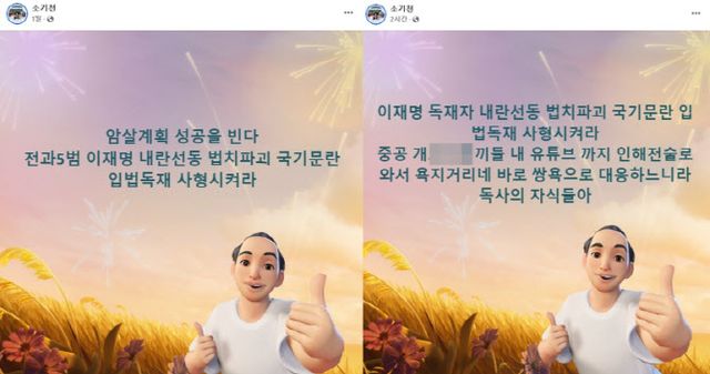 소 전 교수가 이러한 글을 올린 이유는 지난 12일 그가 자신의 SNS에 이 대표의 ‘암살 성공’을 기원하자 일부 누리꾼들이 비판 댓글을 달았기 때문이다. 소 전 교수는 “암살계획 성공을 빈다. 전과5범 이재명 내란선동 법치파괴 국기문란 입법독재 사형시켜라”라며 또다른 글에도 “이재명이 죽어야 문재인도 죽고 임종석도 죽는다”고 썼다. 해당 게시글에는 누리꾼들의 지탄 댓글이 달렸지만 소 전 교수는 모두 삭제 처리하고 있다.