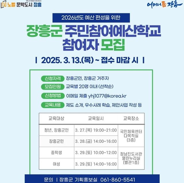 한편, 장흥군은 2026년도 주민참여예산 편성을 위해 총 20억 원 규모의 제안사업 공모를 진행하고 있으며, 지역에 거주하거나 생활권을 두고 있다면 누구나 신청할 수 있다.