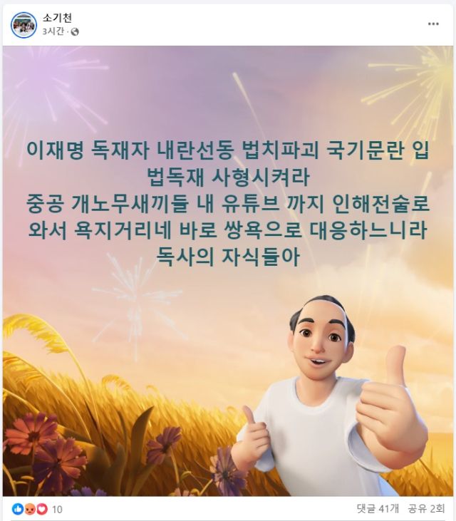또 "중공 개노무새끼들 내 유튜브까지 인해전술로 와서 욕지거리네. 바로 쌍욕으로 대응하느니라. 독사의 자식들아"라고도 적었다.