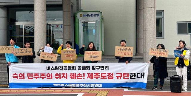 시민연대는 14일 제주도청 제2청사 앞에서 기자회견을 갖고 도의 입장에 대해 "주민 참여를 방해하는 제주도정을 규탄한다"며 "심의회는 버스 완전공영제 논의를 숙의형 정책개발 대상으로 채택하라"고 강조했다.
