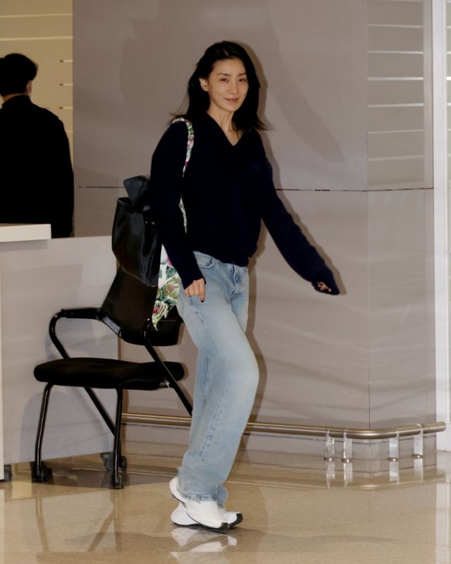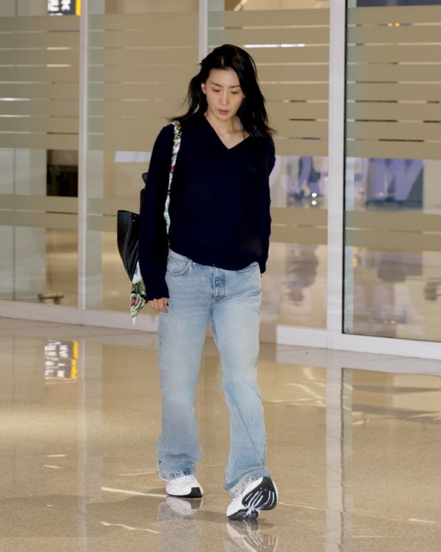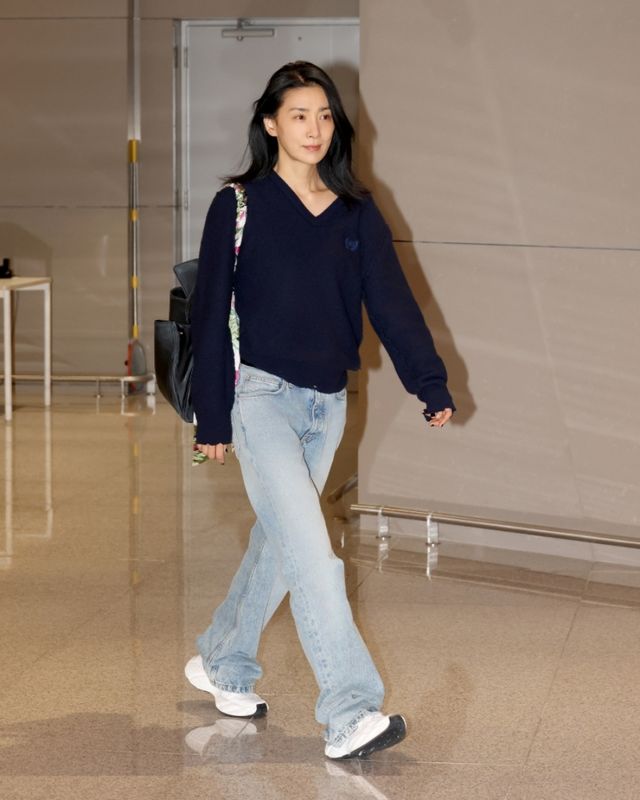 이날, 김서형은 발렌시아가 여름 25 컬렉션에서 선보인 내추럴한 무드가 돋보이는 네이버 컬러의 브이넥 니트와 로우 웨이스트 스트레이트 데님, 벨트를 매치하여 시크하면서도 스타일리시한 공항패션을 선보였다.