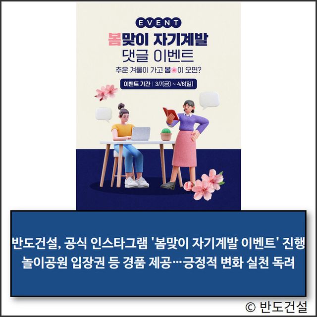 웹진 및 유튜브 등 다양한 채널을 통한 소비자와의 적극적인 커뮤니케이션을 전개하고 있는 반도건설이 따스한 봄을 맞아 공식 인스타그램 채널에서 '봄맞이 자기계발 댓글 이벤트'를 진행한다.
