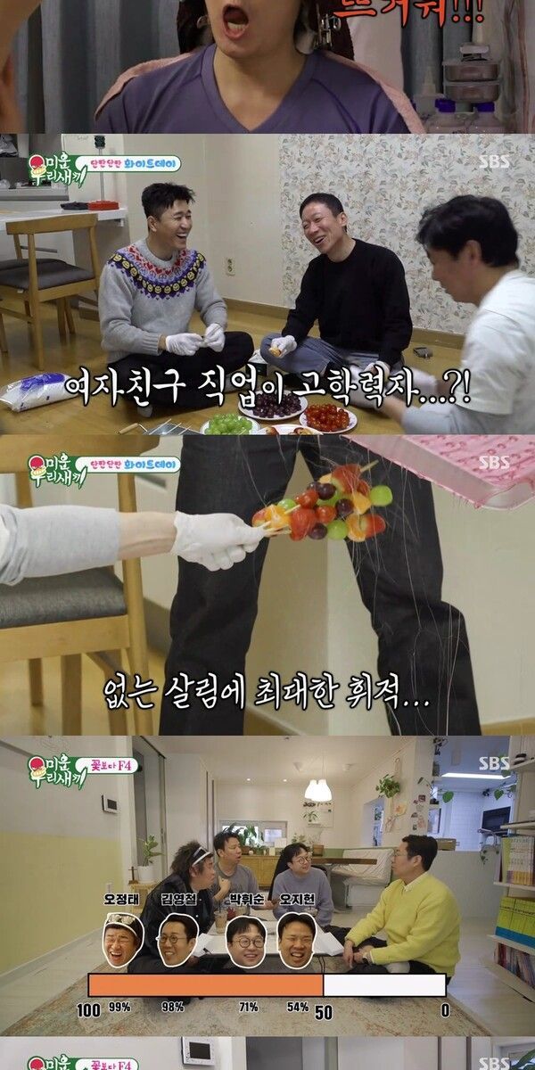오지헌은 “우린 Y 유전자가 못생겨서, X 유전자가 중요하다”라고 주장했고, 오정태 역시 “딸 교정부터 시켜줬다. 애가 원하면 뭐든 해줄 것”이라 거들었다. 박휘순 역시 “아이에게 목돈 들어갈 걸 대비해 적금을 들고 있다”라고 밝혔다.