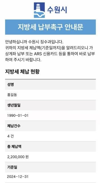 [와이뉴스] 수원시가 ‘모바일 전자고지 시스템’을 활용해 지방세와 세외수입 체납자 16만여 명을 대상으로 올해 12월까지 전자문서 형태의 체납안내문을 발송한다.