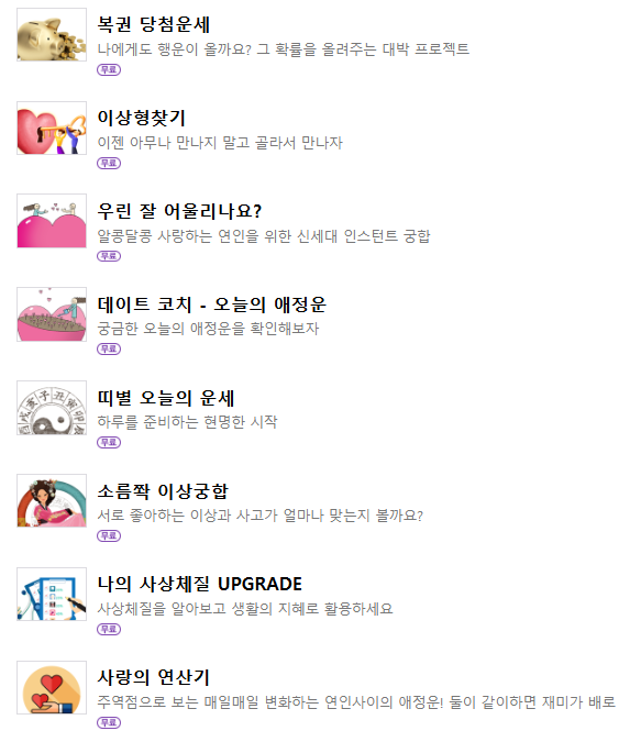 온라인 사주 전문 사이트 '위키사주'는 오랜 전통을 바탕으로 한 사주팔자와 현대적인 분석 기술을 결합하여 각자의 운명을 상세히 분석한다. 이름과 생년월일, 태어난 시간과 성별을 입력하면 간단하게 이용할 수 있다. 만사형통 내 운명의 비밀 사주, 쓸모있는 사주 감정, 복잡한 세상 편하게 사는 소름돋는 비법 사주까지 다양한 운세를 재미있게 점칠 수 있다.