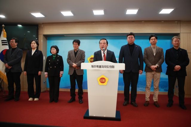 국민의힘 제주도의원들은 민주당 주도로 추진한 감사원장과 서울중앙지검장 등 공직자에 대한 탄핵 소추안이 잇따라 기각된 것에 대해선 "정부를 무시하고 짓밟아 국정 운영을 국헌 문란"이라며 "민주당은 상응하는 대가를 치르고 국민들 앞에서 사과해야 한다"고 주장했다.
