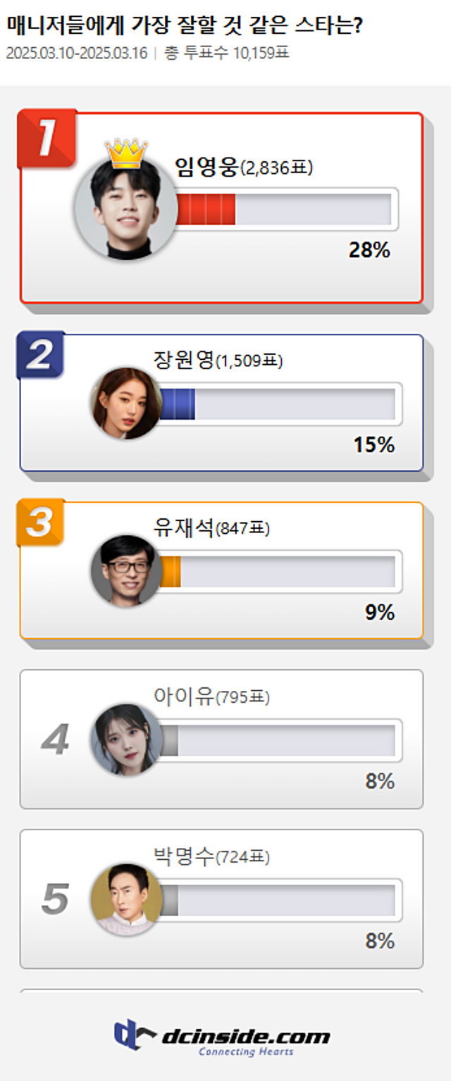 커뮤니티 포털사이트 디시인사이드가 `매니저들에게 가장 잘할 것 같은 스타는?`으로 투표를 한 결과 임영웅이 1위에 올랐다. 이 투표는 지난 10일부터 16일까지 총 7일간 진행했다.