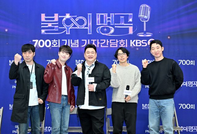 17일 서울 영등포구 여의도동 KBS에서 KBS2 예능프로그램 ‘불후의 명곡’ 700회를 맞아 기자간담회가 열렸다. 이 자리에는 MC 김준현, 이찬원, 박형근PD ,김형석PD, 최승범PD가 참석했다. 또 다른 MC 신동엽은 스케줄 상 아쉽게 참석하지 못했다.
