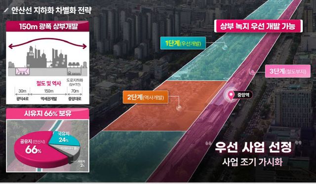 앞서 국토교통부는 지난달 안산시가 준비해온 안산선 지하화 사업을 우선추진사업 대상으로 선정됐다. 안산선 지하화·상부 개발 사업은 초지역~고잔역~중앙역을 포함해 지상에 설치된 5.12㎞ 구간의 철로를 주변 지하로 옮기고 기존 철도 부지와 전철역 상부 등을 합쳐 71만2000㎡를 개발하는 것이다. 사업 대상지 폭은 150m이다. 시는 대상지 주변 지상 도로인 광덕4로(폭 30m)와 중앙대로(폭 70m)도 일부 구간에 걸쳐 지하화할 예정이다. 도로를 지하화하면 상부를 광장으로 만들어 시민이 도로보 오갈 수 있게 한다.