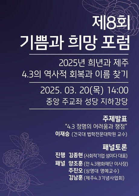 [한라일보] 천주교 제주교구는 오는 20일 오후 2시 중앙성당 지하 강당에서 '2025년 희년 제주4·3의 역사적 회복과 이름 찾기'를 주제로 제8회 제주 기쁨과 희망 포럼을 연다.