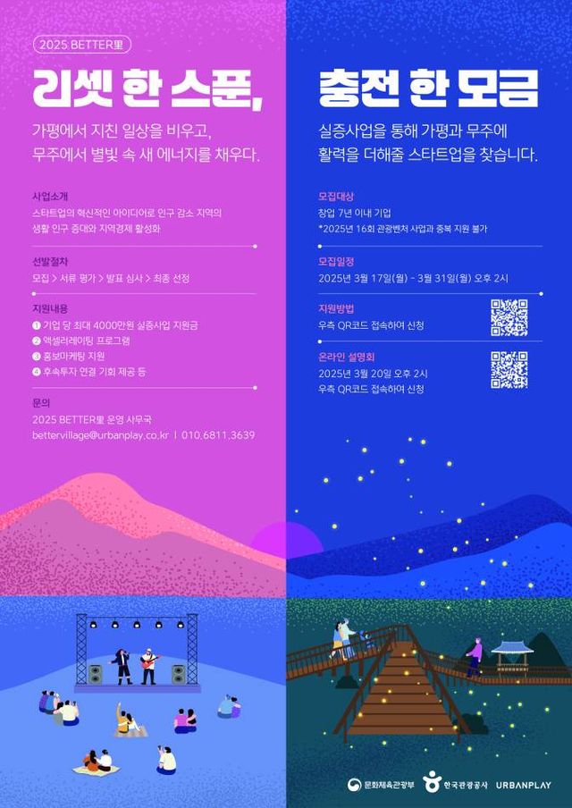 문화체육관광부와 한국관광공사(이하 공사)는 17일부터 오는 31일까지 '2025 BETTER里' 실증사업에 참여할 스타트업을 모집한다.