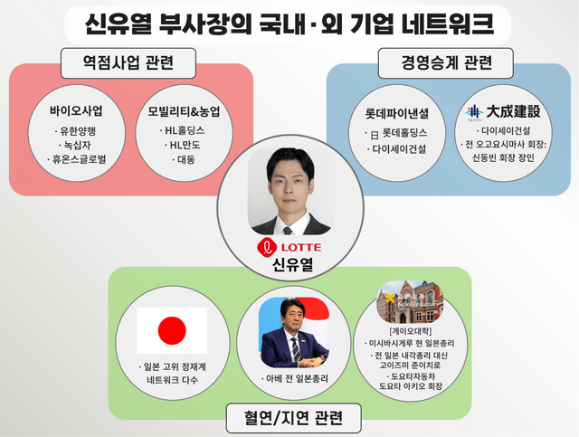 신 부사장의 탄탄한 일본 학맥도 주목된다. 신 부사장은 와세다대학과 함께 일본 최고의 사립대학으로 불리는 게이오기주쿠대학을 나왔다. 이시바 시게루 현 일본 총리를 비롯해 전 일본국 내각총리대신 고이즈미 준이치로와 하시모로 류타로, 아베 전 총리의 친동생인 기시 노부오 전 방위대신 등 일본의 정치 거물이라 불리는 인물들이 전부 게이오기주쿠대학 출신이다.