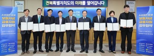 17일 전북특별자치도청에서 전북도와 KB국민은행·NH농협은행·신한은행·우리은행·전북은행·하나은행·카카오뱅크·전북신용보증재단이 '소상공인 회생 보듬자금 금융지원 업무협약'을 맺고 있다. 2025.3.17 [전북특별자치도 제공. 재판매 및 DB 금지]