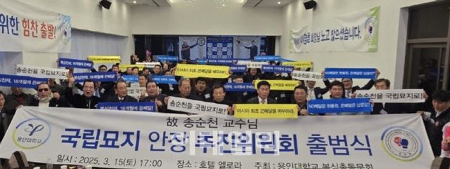 16일 용인대학교에 따르면 격기지도학과 복싱총동문회는 지난 15일 오후 용인시 호텔 엘로라에서 ‘고 송순천 용인대 명예교수 국립묘지 안장 추진위원회’ 출범식을 개최했다. 이날 출범식에는 김진표 격기지도학과 교수, 김영관 복싱총동문회 회장, 애틀랜타 올림픽 은메달리스트인 이승배 전 복싱 국가대표팀 감독, 배우 임혁 등 150여 명이 참석했다.