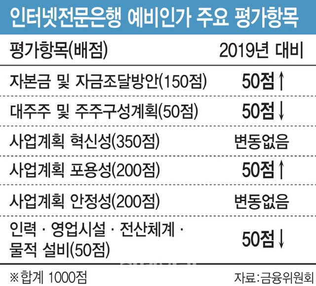 이번 제4인터넷전문은행은 ‘소상공인 특화은행’의 경쟁으로 압축되고 있다. KSB 컨소시엄은 170만 소상공인·자영업자가 사용하는 캐시노트를 기반으로 소상공인 특화 신용평가체계(CSS) 개발, 공급망 금융 등을 내세우고 있다. 인가 키를 쥔 금융위원회는 이달 25~26일 인가신청을 받고 2개월 이내 예비인가 심사결과를 발표한다. 인가기준을 충족하는 사업자가 없다고 판단하면 예비인가를 하지 않을 수 있다. 금융위는 종전에 비해 자본금·자금조달방안, 사업계획 포용성 항목을 중점적으로 살펴볼 계획이다.