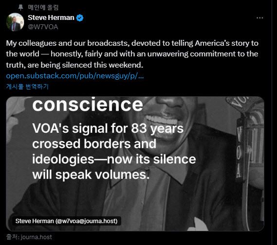 마이클 어브래머위츠 VOA 총국장은 페이스북에 “VOA가 83년 만에 처음으로 침묵 당해 매우 슬프다”고 썼다. VOA 한국어 홈페이지에는 ‘방송국 사정으로 현재 방송 업데이트가 정상적으로 이뤄지지 않는다’는 공지가 뜬 상태다.