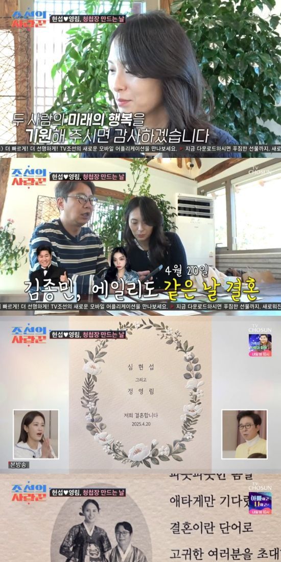 이날 심현섭과 정영림이 오는 4월 20일 결혼식을 앞두고 청첩장을 골랐다. 심현섭은 미리 준비한 청첩장 글귀를 낭독했고, "파릇파릇한 봄날 애타게만 기다렸던 결혼이라는 단어로 고귀한 여러분들을 모십니다. 축하해 주셔서 감사드리며 두 사람 미래의 행복을 기원해 주시면 감사하겠습니다. 신부 정영림, 신랑 심현섭 올림"이라며 밝혔다.
