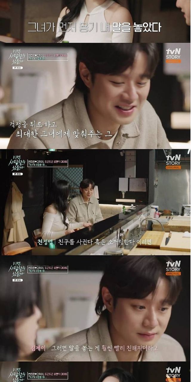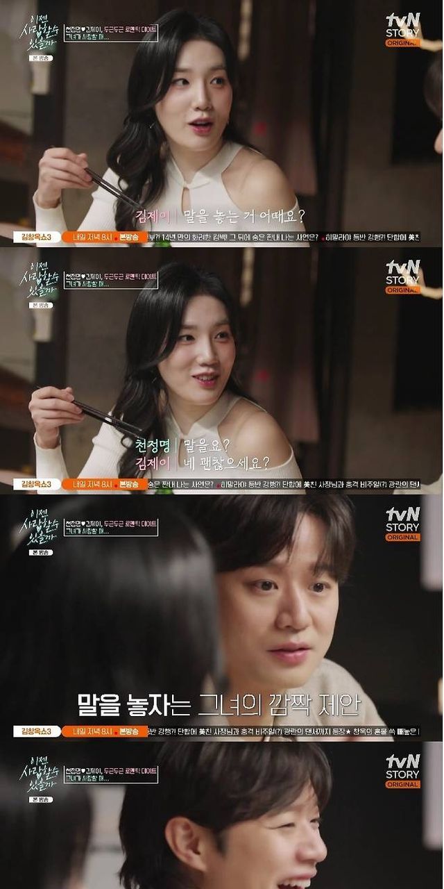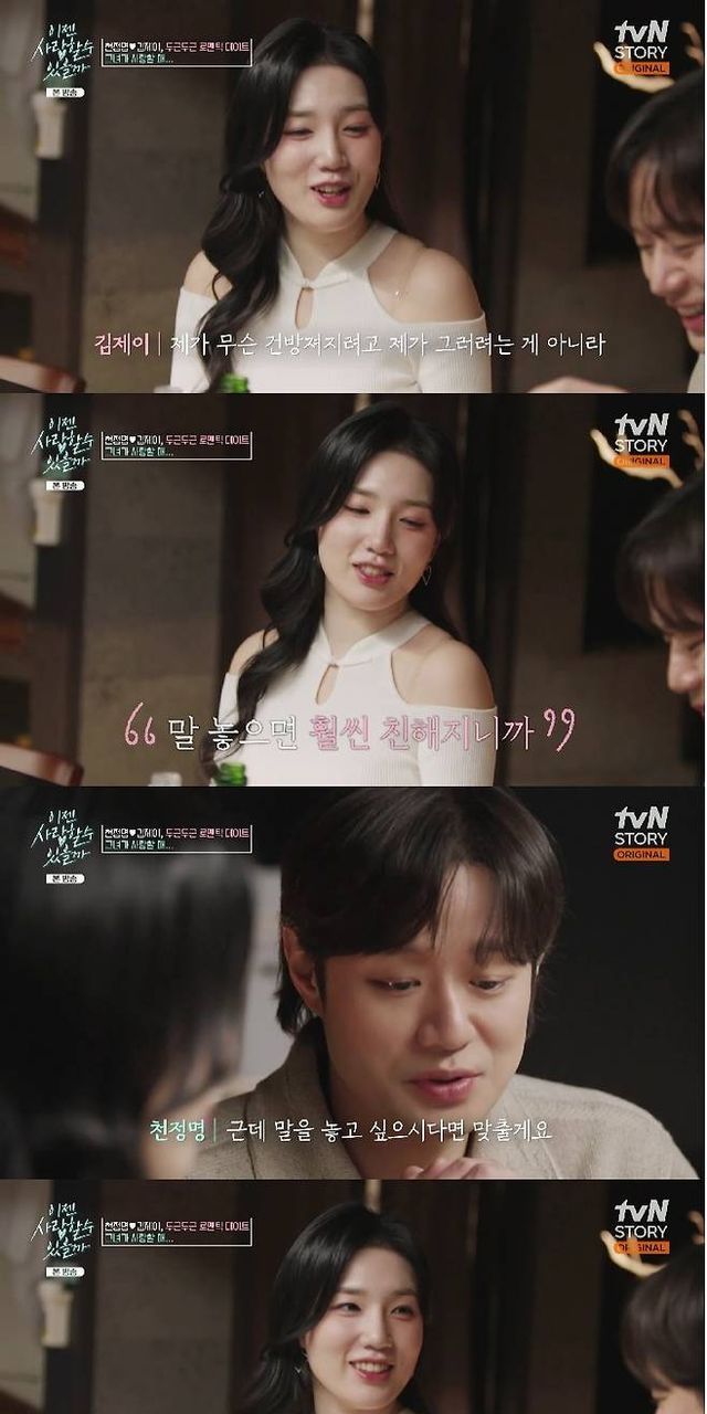 천정명은 "친구들, 지금처럼 편안하게 친구를 사귄다 혹은 소개팅한다 이러면 말 편하게 하는 스타일이냐"라며 김제이의 성격을 궁금해했다.