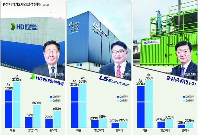 17일 업계에 따르면 K전력기기 3사가 지난해 처음으로 합산 영업이익 1조원을 돌파했다. HD현대일렉트릭 6690억원, LS일렉트릭 3897억원, 효성중공업 3625억원으로 총 1조4212억원의 영업이익을 챙기는 등 호실적을 올렸다.