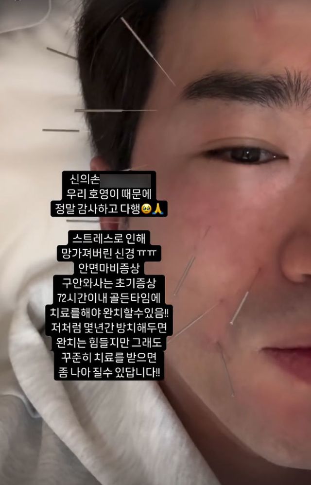 이민우는 17일 자신의 SNS에 침 치료를 받고 있는 사진과 함께 “스트레스로 인해 망가져 버린 신경. 안면마비 증상 구안와사는 초기 증상 72시간 이내 골든타임에 치료를 해야 완치할 수 있음”이라고 설명했다.