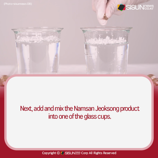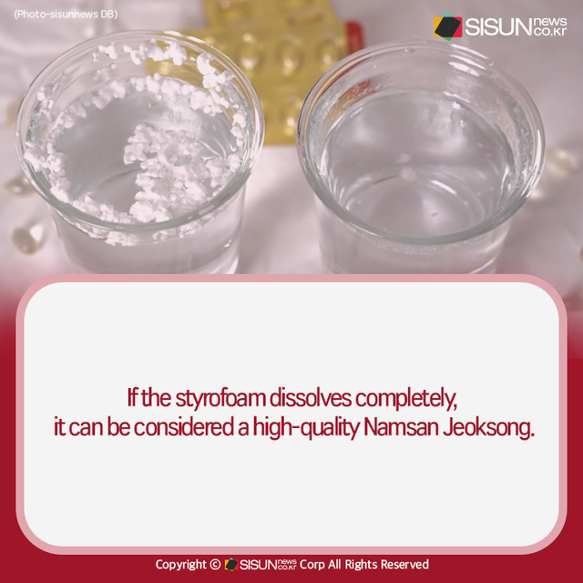 This can be tested through an experiment. First, fill a glass with water and place a piece of styrofoam in it. Next, add and mix the Namsan Jeoksong product into one of the glass cups. If the styrofoam dissolves completely, it can be considered a high-quality Namsan Jeoksong.