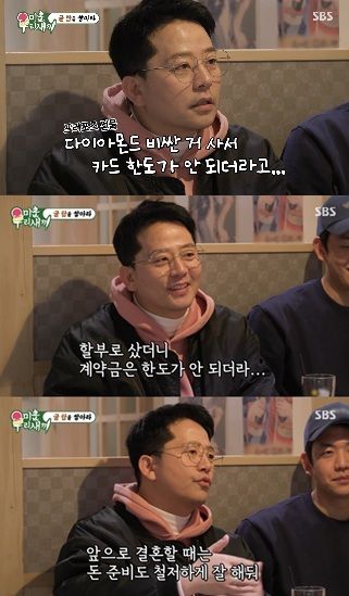 그는 "내가 다이아몬드 할부로 샀지 않냐. 할부로 샀더니 계약금은 한도가 안 되더라"라며 "앞으로 결혼할 때는 돈 준비는 딱 철저히 해놓아야지 방심했다가는 큰일 난다"고 전했다.