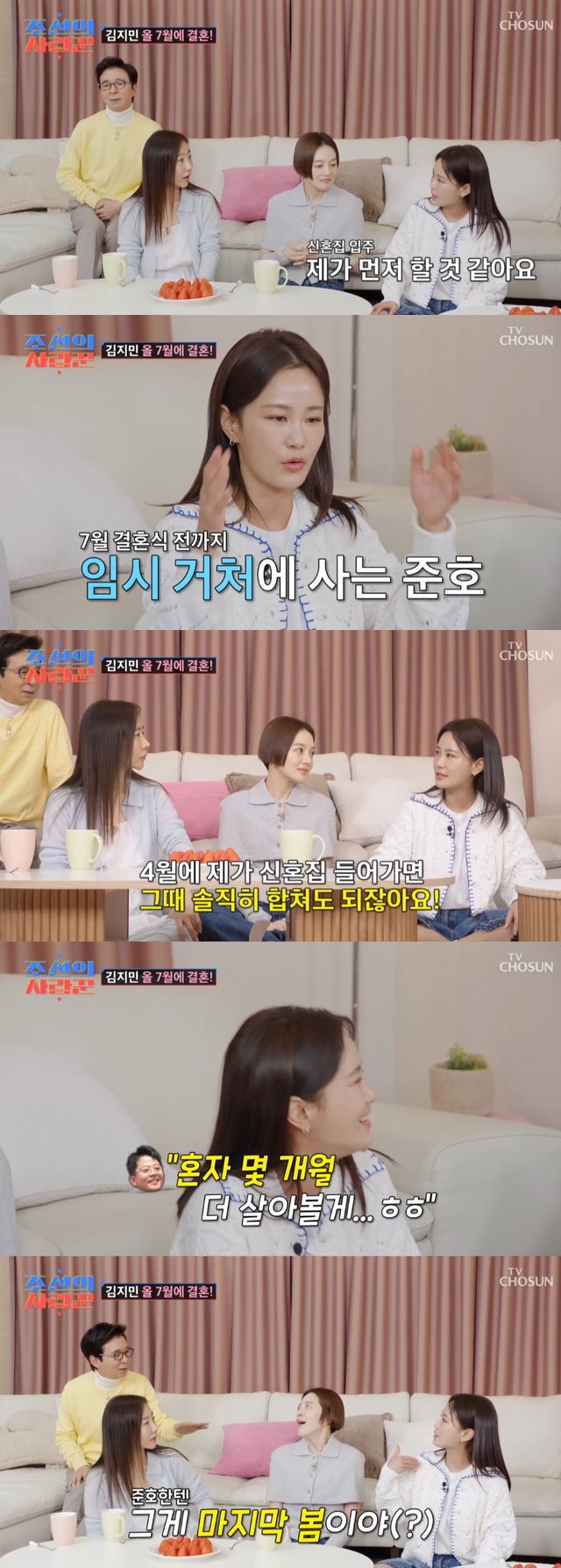 "제가 4월에 신혼집 들어가면 솔직히 합쳐도 되지 않냐. 그런데 혼자 몇 개월 더 살아보겠다고 하더라"라고 토로한 김지민은 김준호는 7월 결혼식까지 오피스텔에서 혼자 살 예정임을 알렸다.