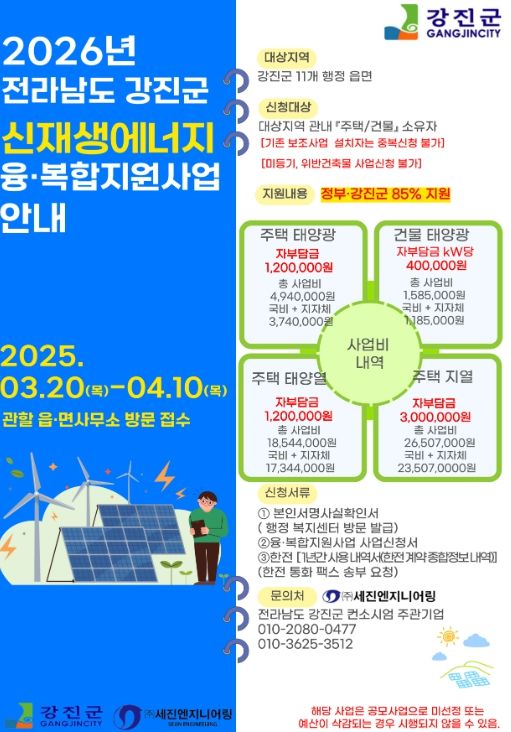 [파이낸셜경제=김영란 기자] 강진군이 산업통상자원부와 한국에너지공단이 주관하는 ‘2026년 신재생에너지 융복합지원사업’ 공모 신청을 위한 수요조사를 오는 20일부터 4월 10일까지 실시한다.