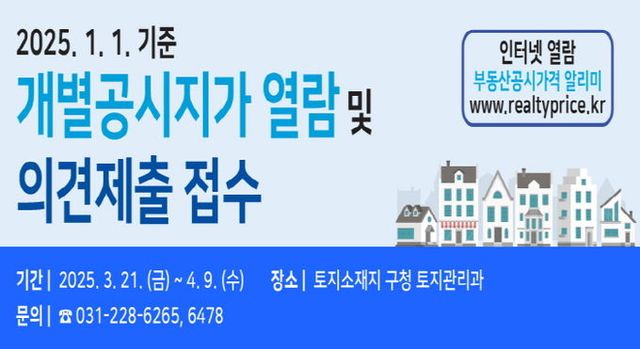 개별공시지가는 부동산 관련 세금 및 각종 부담금 부과의 기초자료로 활용되므로 토지소유자 및 이해관계인은 기한내에 의견제출을 할 수 있다. 지가열람은 권선구청 토지관리과 및 관할 행정복지센터에서 가능하며, 온라인 열람은 부동산공시가격알리미 홈페이지에서 가능하다.