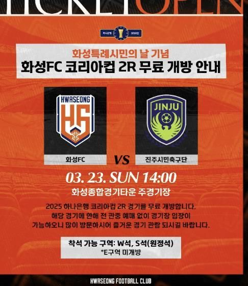 [와이뉴스] 화성특례시가 화성특례시민의 날을 맞아 오는 23일 화성종합경기타운 주경기장에서 열리는 화성FC와 진주시민축구단의 ‘2025 하나은행 코리아컵’ 2라운드 홈경기를 무료로 관람할 수 있는 혜택을 제공한다.