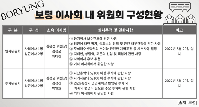 심지어 보령의 이사회에는 이사의 보수한도를 결정하는 별도의 위원회가 아닌 인사위원회에서 이를 결정하고 있다. 보령의 인사위원회에선 임원에 대한 평가와 성과보상, 보수한도 등을 정한다.